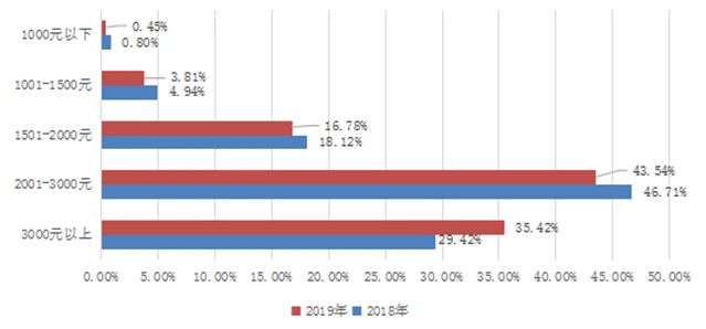 2018、2019年全省中等职业学校毕业生就业起薪情况