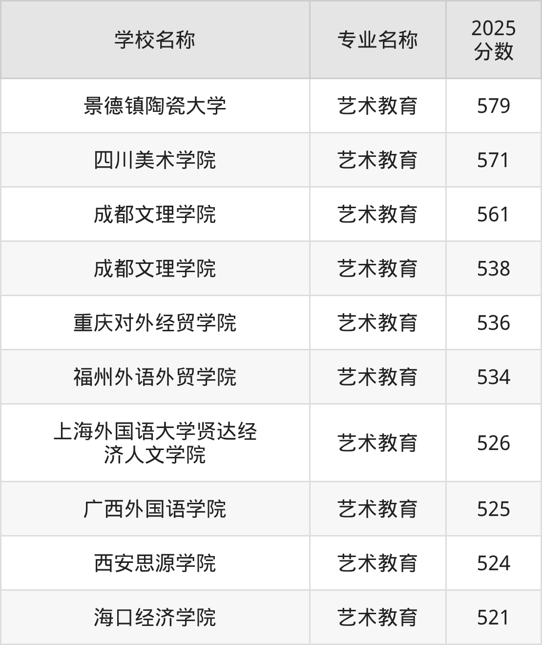 500分的大学有10所,其中分数最高的是景德镇陶瓷大学,艺术教育收分为579分。
