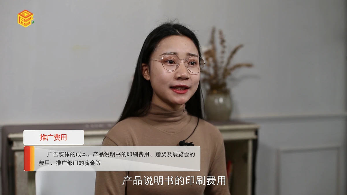 2、推广费用:广告媒体的成本、产品说明书的印刷费用、赠奖及展览会的费用、推广部门的薪金等。