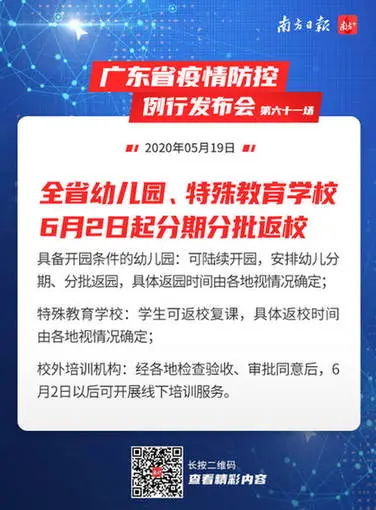 答:经省新冠肺炎疫情防控指挥部研究决定,全省幼儿园、特殊教育学校按照国家和省有关规定进行现场检查验收、审批同意后,自6月2日起可分期、分批组织学生(幼儿)返园返校。