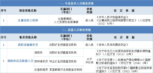 从国家人力资源和社会保障部下发的国家职业资格目录里可以看到,关于消防行业的,有三个资格证书:一个是注册消防工程师,它属于专业技术人员职业资格;另外两个是消防设施操作员、消防和应急救援人员(消防员、森林消防员、应急救援员),它属于技能人员职业资格。