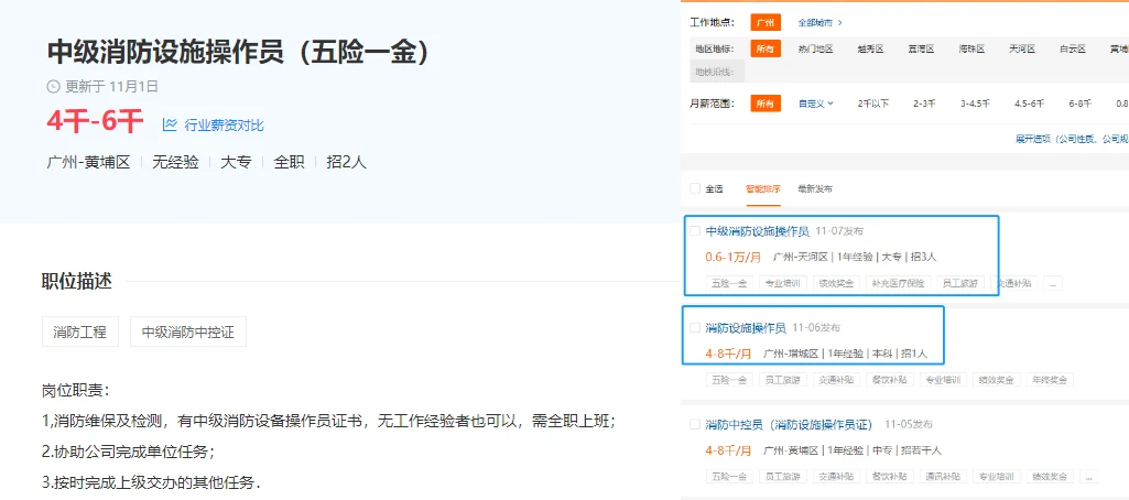 这个职业的任职要求和总体薪酬待遇如何呢?记者综合各招聘信息发现,这个职业对学历的要求以专科为起点,其任职的基础要求为具备消防设备操作员的证书,需要有一定的检测能力及撰写报告能力。以广州这样的一线城市看,这个职业的薪酬在4000元-1万元,上升渠道是消防安全管理人、消防安全负责人,国家一二级注册消防工程师等等。