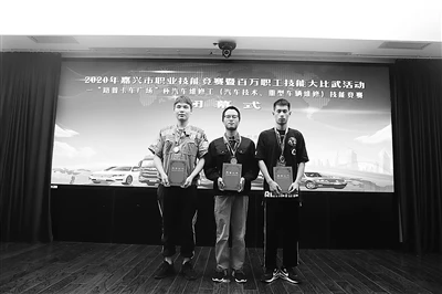 嘉职院推送的两名选手(中、右)分获汽车技术赛项第一、三名。