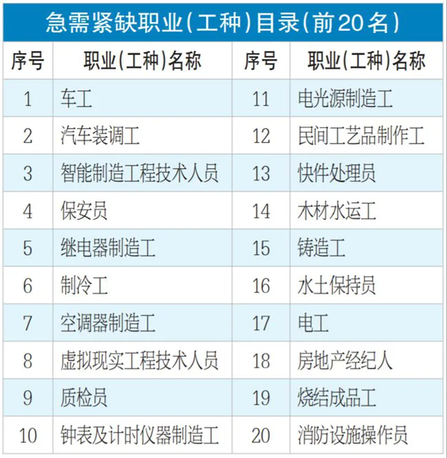 经综合分析后,排序形成了100个紧缺职业工种目录。