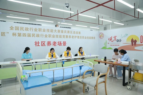 “竞赛采用一轮制,由理论知识竞赛、实操技能竞赛两部分组成。”重庆市民政局相关负责人介绍,实操技能竞赛包含操作技能单项赛和操作技能组合赛。选手按试题情境要求分别在居家、社区、机构三个场景赛室完成生活照护、康复服务、基础照护三项单项实操技能,心理支持及其他技能融入其中。操作技能组合赛则以老年人一天的生活为中心,以养老护理员岗位一天的服务内容为主线,以基础照护、康复照护、心理支持三个单项技能模块为主体,组合成一组综合实操模块,选手在一个情境化竞赛区完成操作任务,主要考核选手在综合情境下的实操技能。