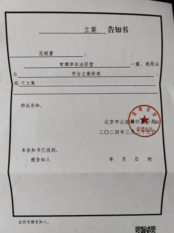 2024年3月30日,北大教师眼疾被治“失明”案当事人范晓蕾收到北京市公安局怀柔分局作出的《立案告知书》,显示曾被她控告的涉案企业北京北普飞龙气体有限公司(下称北普公司)原销售经理常博萍,被立案侦查,涉嫌的罪名为“非法经营”。这份告知书的落款时间为3月29日。