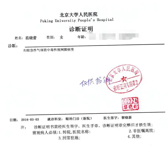 在北京熙仁医院术后治疗20天后,范晓蕾右眼疼痛,视力也由0.8逐步下降至0.02。为寻找眼睛“失明”的证据,追究相关责任方,范晓蕾开始了长达8年的维权之路。这一消息被媒体曝光后,引发广泛关注。起初,范晓蕾以为气体质量问题是“元凶”,但进一步了解后她发现,涉事气体生产商只有工业用八氟丙烷生产资质。这意味着,北京熙仁医院医生为其注入的是工业用八氟丙烷。